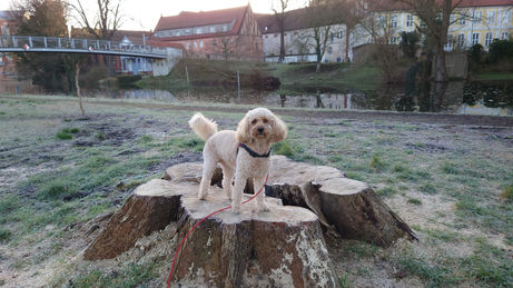 Ronya ist eine mittelgroße Labradoodle-Hündin, sehr menschenbezogen, verschmust und immer noch sehr verspielt. Wir beschäftigen uns viel miteinander. Sie ist überall dabei. Ich habe mit ihr Kurse belegt, um Treibball zu lernen und Longieren. Ronya mag gerne Tricks zeigen und wir haben beim Dogdance hineingeschnuppert. Es ging bei etlichen Kursen auch um Impulskontrolle.